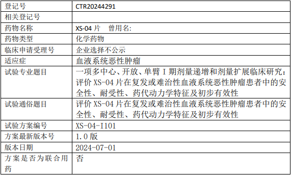 星盛新辉XS-04临床试验,评价XS-04片治疗复发或难治性血液系统恶性肿瘤安全性、耐受性、药代动力学特征及初步有效性的I期临床试验
