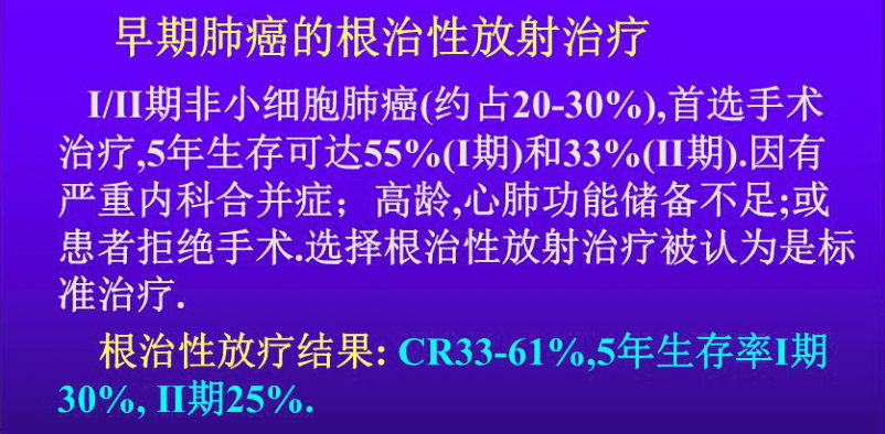 如果是极早期的肺癌,尤其是早期非小细胞肺癌,若患者不宜采取手术治疗,早期采用立体定向放射治疗可以达到临床治愈的效果。